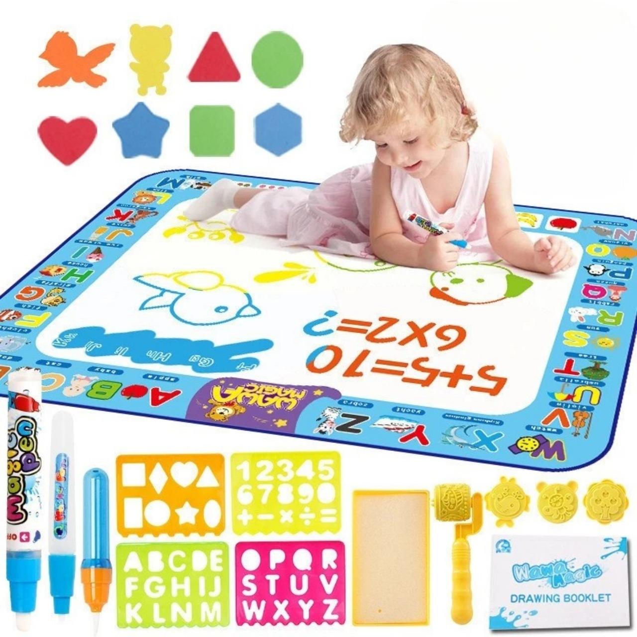 | A csomag tartalma: | 1x vízzel rajzoló szőnyeg (100 × 80 cm), 3x vízfilc, 6x sablon + henger, 1x festőalbum, 1x víztartály |