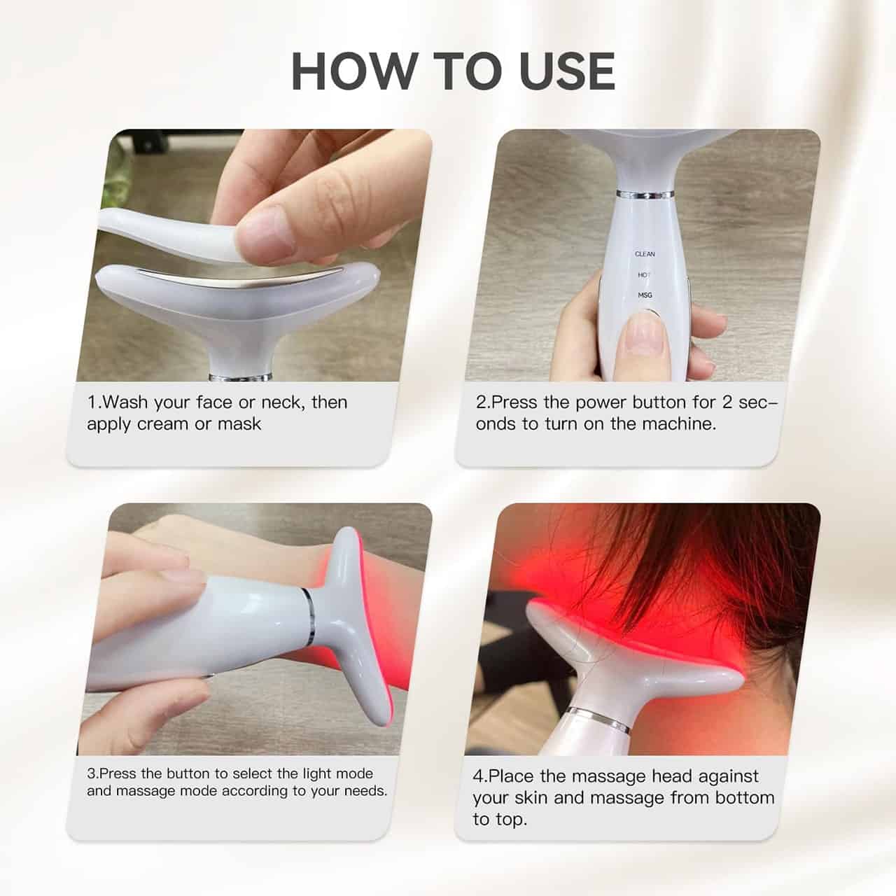 • Alkalmas a nyak, arc, áll és más testrészek masszírozására, ahol a relaxációra és a bőr megjelenésének javítására van szükség